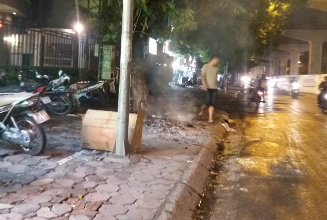 | Trên tuyến phố Nguyễn Thái Học, một cụ bà mang vàng mã đốt dưới gốc cây trước nhà mình làm một khoảng gốc cây bị bám đen và khói bụi bay quanh. Sau khi đốt, tro tàn không được chủ nhân dọn dẹp... |