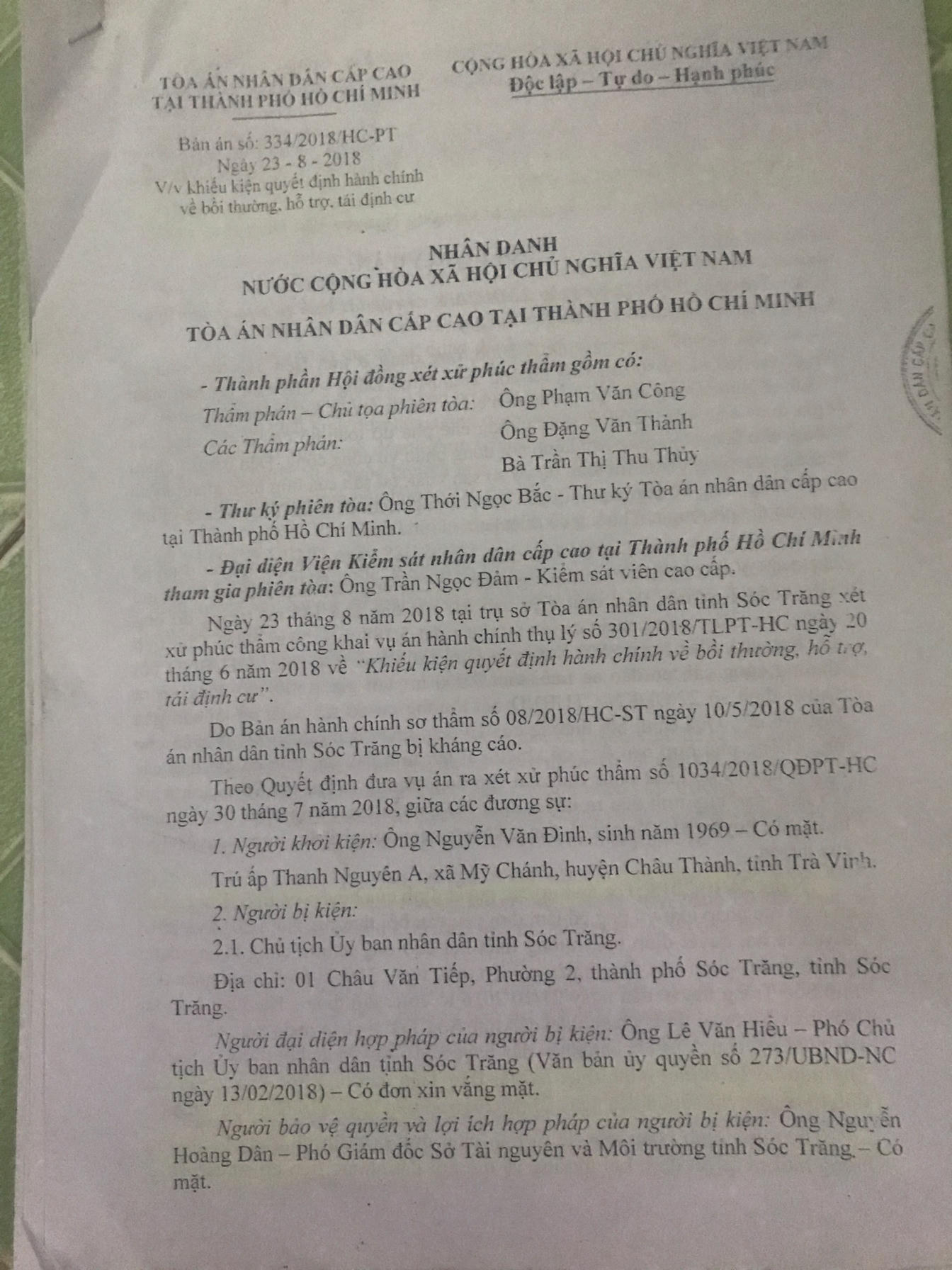 Ngày 23/8/2018 vừa qua, TAND cấp cao tại TP HCM đã mở phiên tòa xét xử phúc thẩm tại trụ sở TAND tỉnh Sóc Trăng vụ án “khiếu nại quyết định hành chính về bồi thường, hỗ trợ, tái định cư”. Trước đó bản án sơ thẩm ngày 10/5/2018 của TAND tỉnh Sóc Trăng bị kháng cáo.