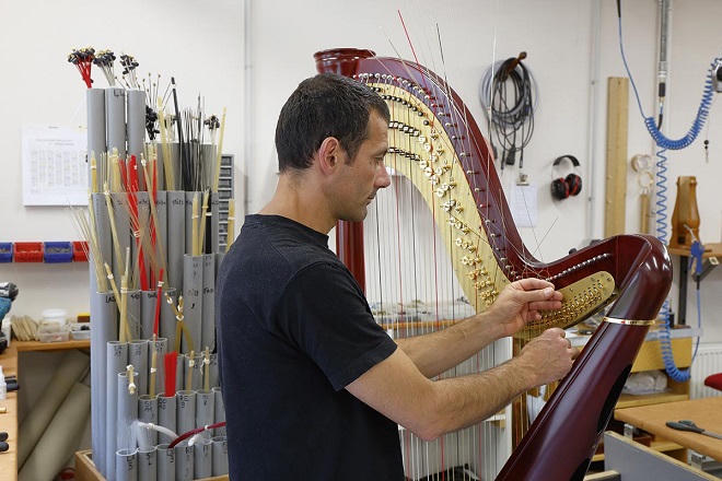 Trước khi đưa khách tham quan vào bên trong nhà máy, Jakez François cho biết qua về thời gian cần thiết để làm ra mỗi cây đàn: "Với dòng Harpe Celtic chẳng hạn và đương nhiên là thời lượng tùy thuộc vào mỗi kiểu đàn, nhưng trung bình chúng tôi cần khoảng từ 1 cho đến 3 và thậm chí là 6 tháng để hoàn tất một cây đàn Celtic. Còn với dòng Harpe có pédale thì mất từ 4 đến 12 tháng"