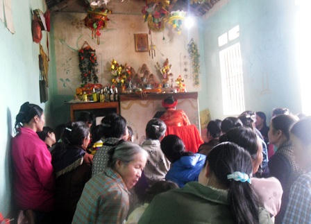 Từ ngoài nhìn vào đã thấy rất đông tín đồ đến se duyên, “cưới âm”, hoặc xin nước giải bùa, chữa bệnh ở nhà “đồng” Thức. Trong căn nhà cấp bốn khoảng hơn 10m2 nồng nặc mùi khói nhang, phía trên điện thờ, một người đàn bà mặc áo đỏ ngồi tựa lưng trên chiếc ghế đẩu, đang phán những câu gì đó bằng tiếng Mường khiến người ở dưới chắp tay vái lạy.