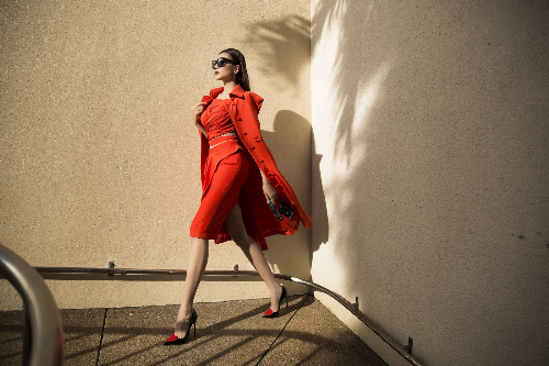 Tone cam nổi bật, trắng thanh lịch hay nude quyến rũ đều được siêu mẫu xử lý thông minh. Trong trang phục tone màu cam, người đẹp khéo léo kết hợp cùng chiếc túi xách nhỏ và mắt kính đen độc đáo để tạo độ tương phản.
