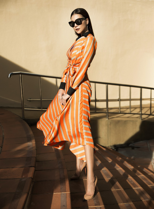 Chiếc váy sọc to tông màu nóng của được Thanh Hằng phối cùng giày cao gót màu nude.