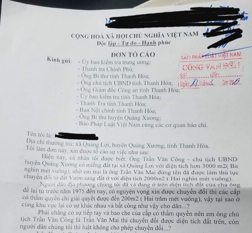 Báo pháp luật Việt Nam nhận được đơn tố cáo của công dân đối với ông Trần Văn Công chủ tịch UBND huyện Quảng Xương