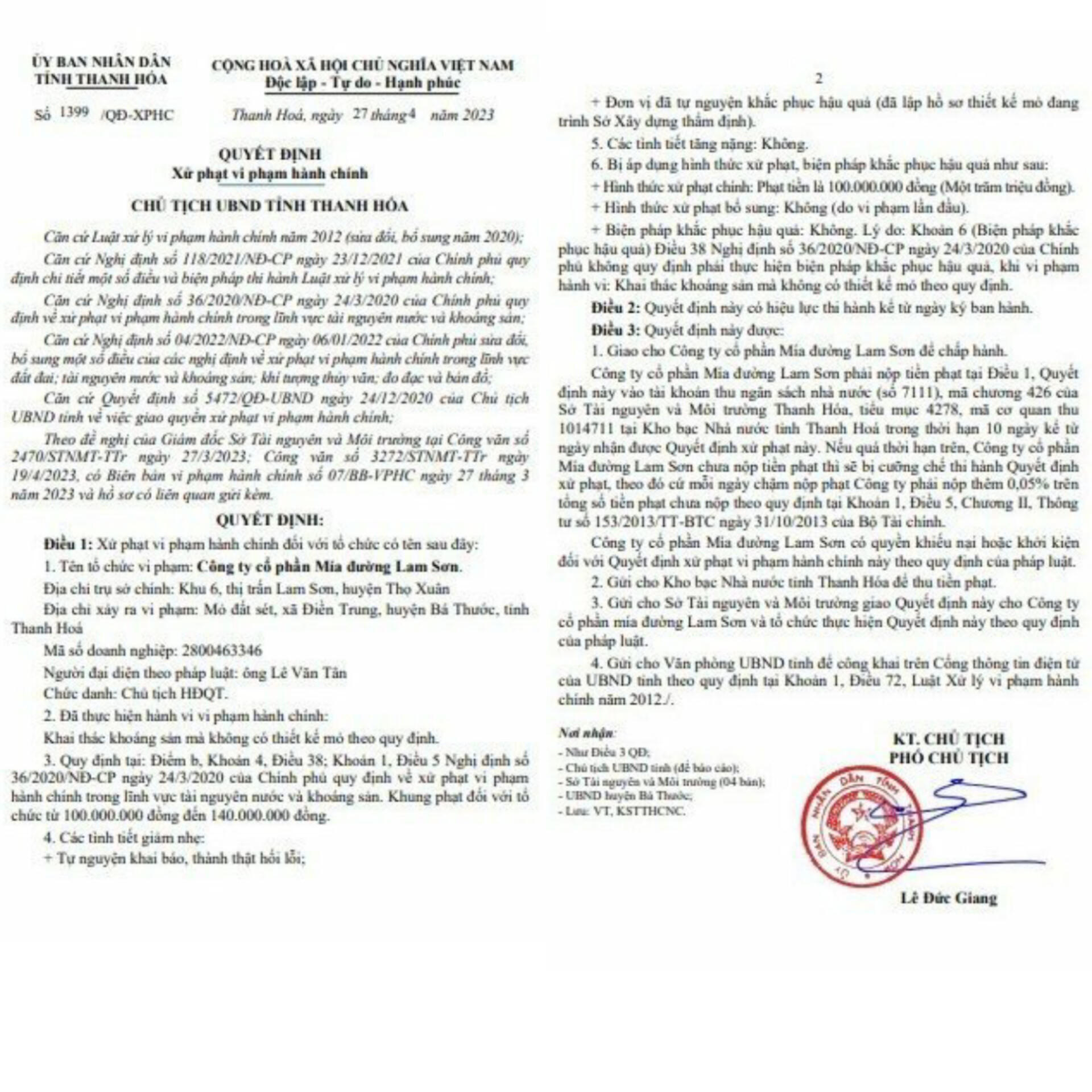 Ngày 27/4, ông Lê Đức Giang, Phó Chủ tịch UBND tỉnh Thanh Hóa vừa ký Quyết định xử phạt vi phạm hành chính đối với Công ty Mía đường Lam Sơn có địa chỉ ở Khu 6, thị trấn Lam Sơn, huyện Thọ Xuân (Thanh Hóa) do ông Lê Văn Tân (Chủ tịch Hội đồng Quản trị) làm người đại diện pháp luật vì đã vi phạm trong trong lĩnh vực khai thác tài nguyên, khoáng sản.