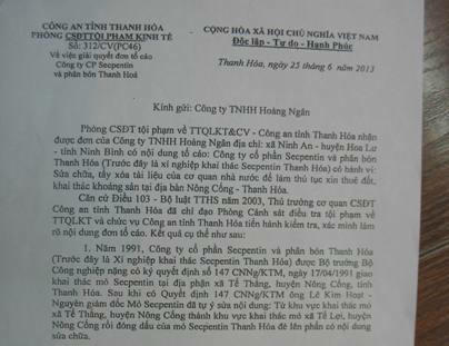(PLO) - Phòng Cảnh sát điều tra Tội phạm kinh tế (PC46) - Công an tỉnh Thanh Hóa vừa có văn bản khẳng định nguyên Giám đốc Công ty cổ phần Secphentin và phân bón Thanh Hóa đã có hành vi tự ý tẩy xóa, chỉnh sửa Quyết định của Bộ trưởng Bộ Công nghiệp nặng (nay là Bộ Công thương) nhằm thay đổi địa điểm khai thác mỏ.