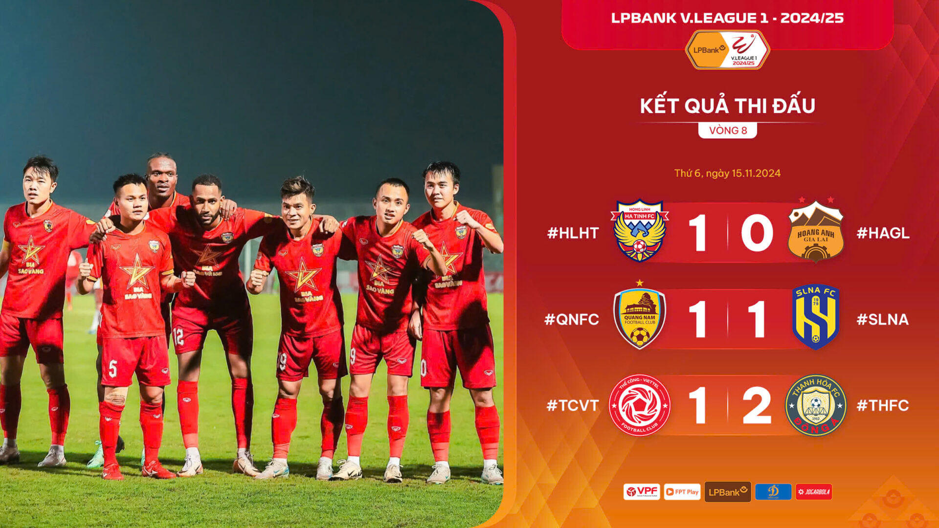 Đông Á Thanh Hóa, Hồng Lĩnh Hà Tĩnh vẫn duy trì phong độ rất cao, ghi tên mình ở các vị trí dẫn đầu bảng xếp hạng sau loạt trận đấu vòng 8 V.League 2024/25 diễn ra chiều qua, 15/11. Ở nhóm cuối, cuộc đối đầu giữa CLB Quảng Nam và Sông Lam Nghệ An kết thúc hòa 1-1 khiến cục diện càng trở nên căng thẳng.