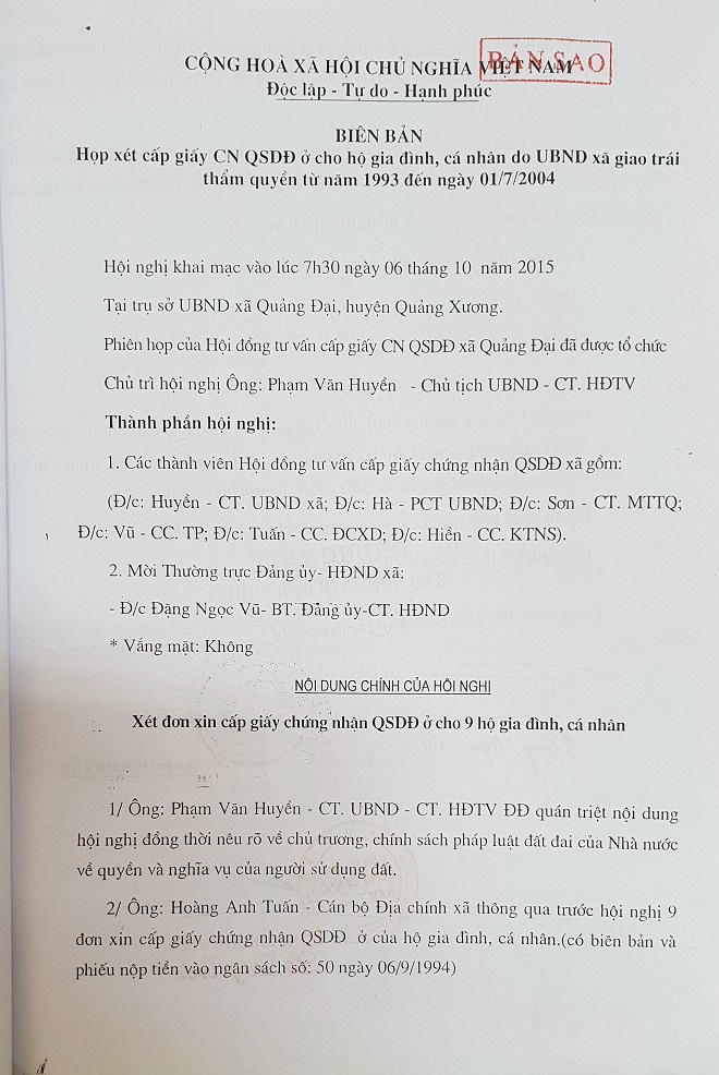 Tận 20 năm sau, ngày 26/10/2015, xã Quảng Đại có Tờ trình số 49/TTr-UBND, do ông Phạm Văn Huyền, Chủ tịch UBND xã ký gửi UBND huyện Quảng Xương đề nghị giải quyết tồn đọng giao đất ở, xét sổ đỏ với 9 hộ để hợp pháp hóa đất mà xã đã bán năm 1994. Ngày 12/11/2015, huyện Quảng Xương có Thông báo số 471/TB-UBND thống nhất hợp pháp hóa diện tích 1.920m2 đất ở cho 9 hộ gia đình này.