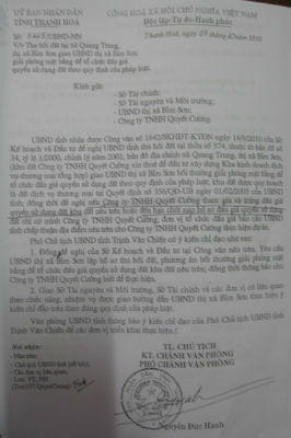 Phúc đáp công văn trên, Cty Quyết Cường đã nghiêm túc chấp hành, nhưng không hiểu sao việc Cty này xin đấu giá đất để thực hiện dự án chưa được thực hiện thì ngày 8/5/2013, UBND tỉnh Thanh Hóa lại có Công văn số 3103 chấp thuận địa điểm trên cho Cty Hồng Phượng, có địa chỉ ở TX.Bỉm Sơn, đầu tư dự án kinh doanh thương mại, tổng hợp và tổ chức sự kiện Hồng Phượng.