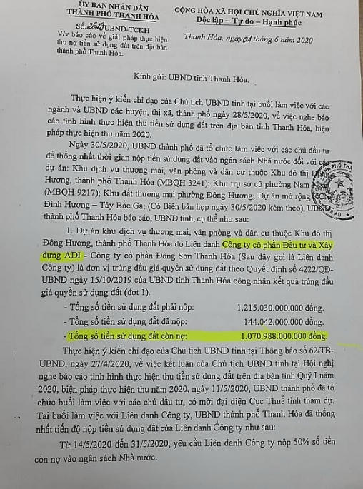 Trước đó, tháng 10/2019, Cty ADI là một trong hai doanh nghiệp (Liên danh) trúng đấu giá Quyền sử dụng đất Khu dịch vụ thương mại, văn phòng và dân cư thuộc Khu đô thị Đông Hương, TP Thanh Hóa (MBQH 3241) theo Quyết định số 4222/QĐ-UBND ngày 15/10/2019 của UBND tỉnh Thanh Hóa. Theo đó, tổng số tiền sử dụng đất phải nộp là: 1.215.030.000.000 đồng.