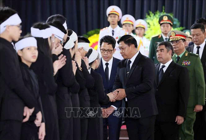 Cũng trong buổi chiều, Tổng Bí thư, Chủ tịch nước Lào Thongloun Sisoulith và Phu nhân cùng Đoàn đại biểu cấp cao Đảng, Nhà nước Lào đã đến viếng Tổng Bí thư Nguyễn Phú Trọng.