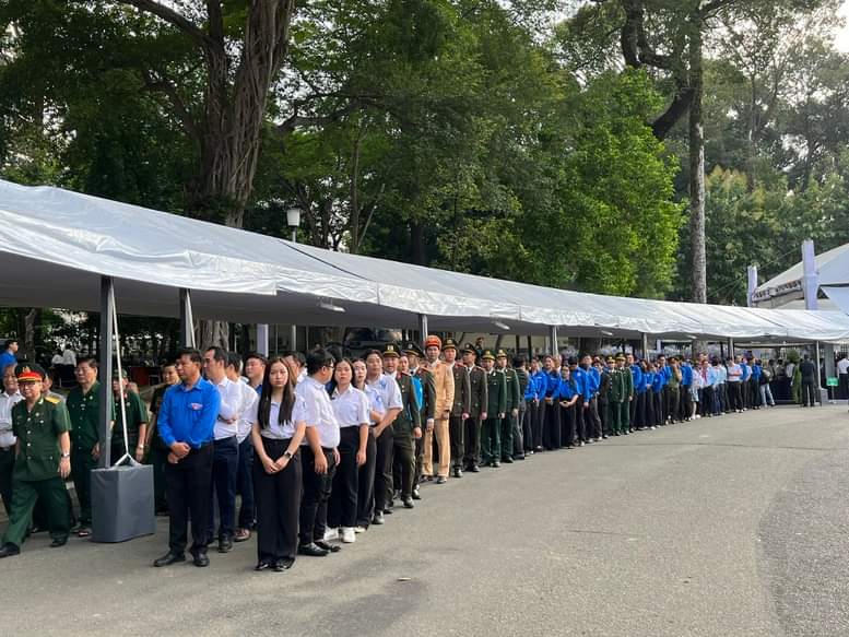 Tại khu vực Hội trường Thống Nhất, TP HCM, đông đảo người dân và du khách đợi từ trước 7h để vào viếng Tổng Bí thư Nguyễn Phú Trọng.