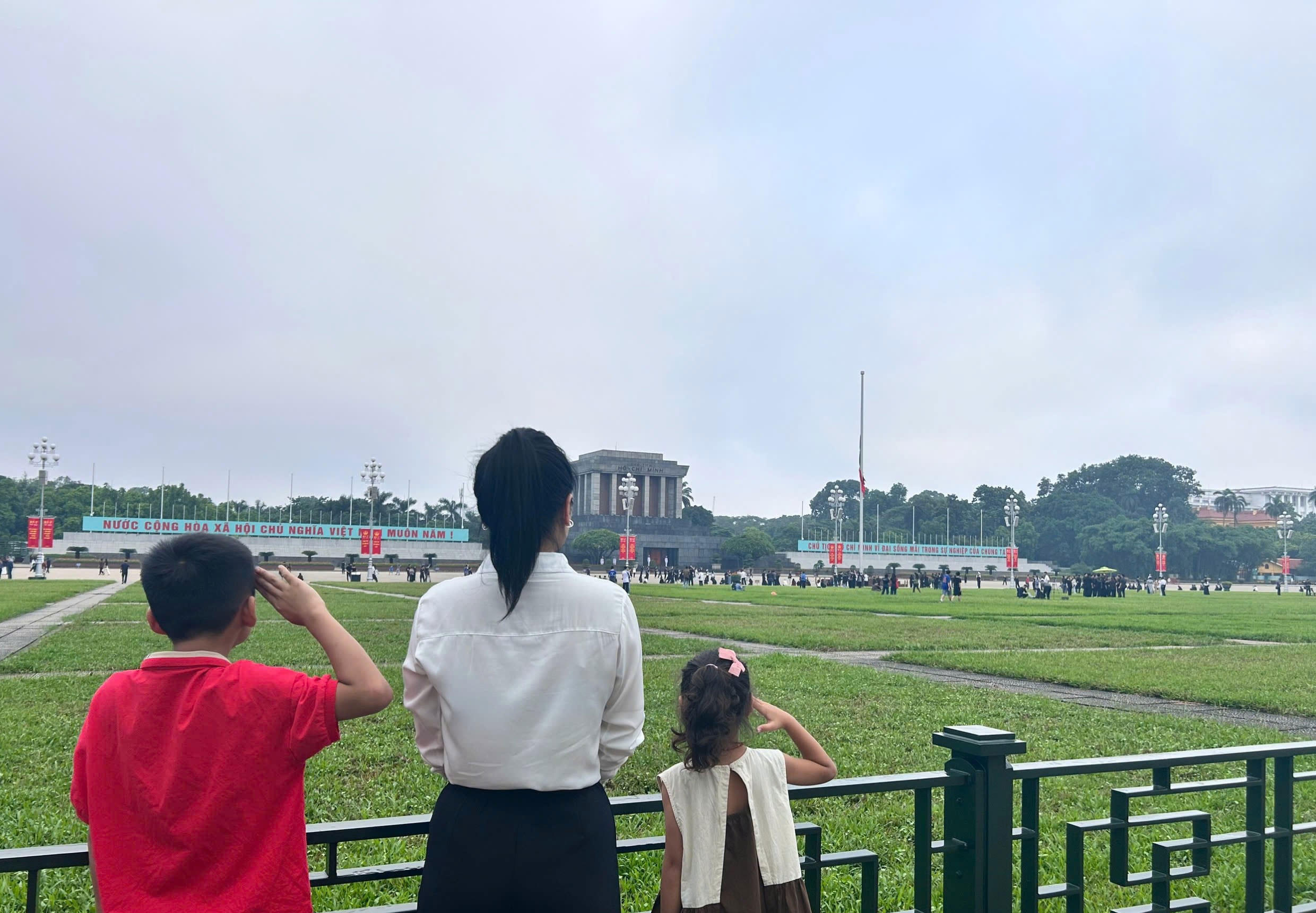 Chị Trần Thị Thuỷ (quận Ba Đình, Hà Nội) cũng đưa 2 con nhỏ đến Quảng trường Ba Đình từ rất sớm. Khi Quốc kỳ được kéo lên, hai con chị nghiêm trang giơ tay chào.