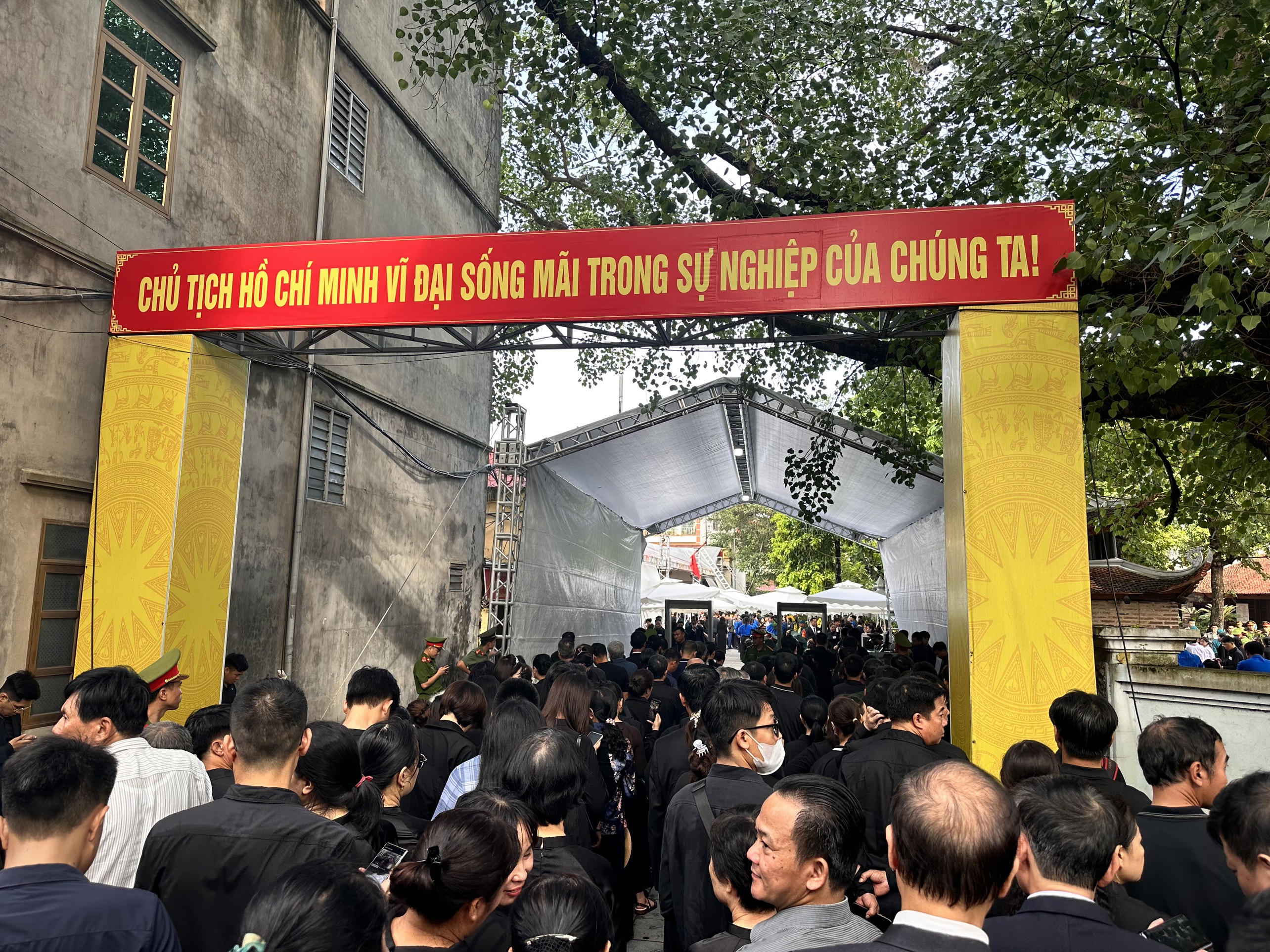Tại quê nhà Tổng Bí thư Nguyễn Phú Trọng - thôn Lại Đà, xã Đông Hội, huyện Đông Anh (Hà Nội), hàng trăm người dân cũng xếp hàng từ sáng sớm chờ viếng Tổng Bí thư.