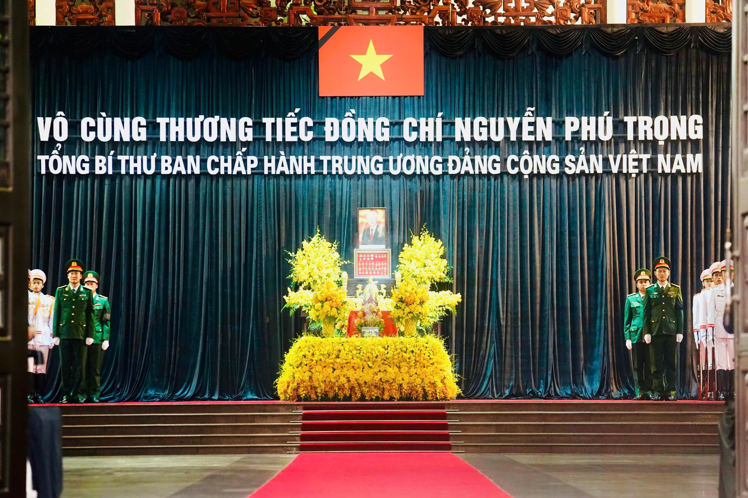 Lễ viếng đồng chí Nguyễn Phú Trọng được tổ chức tại Nhà tang lễ Quốc gia số 5 Trần Thánh Tông, thành phố Hà Nội, từ 7h đến 22h ngày 25/7 và từ 7h đến 13h ngày 26 tháng 7 năm 2024.