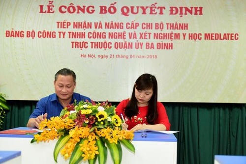 | Đồng chí Đinh Xuân Hải, Quận ủy viên, Bí thư Đảng ủy khối Doanh nghiệp (bên trái) và đ/c Nguyễn Thị Kim Len, Phó Tổng Giám đốc Công ty MEDLATEC ký Biên bản bàn giao đảng viên. |