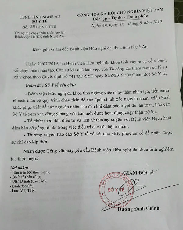 Cùng với đó, Sở Y tế Nghệ An cũng có công văn 2163 về việc ngừng chạy thận nhân tạo tại Bệnh viện Hữu nghị đa khoa Nghệ An. Theo đó, ngày 20/7/2019, tại Bệnh viện Hữu nghị đa khoa tỉnh Nghệ An xảy ra sự cố y khoa về chạy thận nhân tạo.