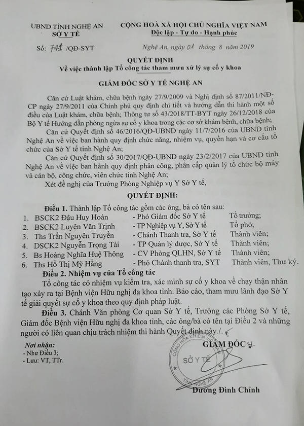Theo đó, tại Quyết định số 741 do Giám đốc Sở Y tế Nghệ An ông Dương Đình Chỉnh đã quyết định Thành lập tổ công tác gồm: Phó giám đốc sở Y tế bác sĩ Đậu Huy Hoàn làm tổ trưởng; Trưởng phòng Nghiệp vụ Y bác sĩ Luyện Văn Tịnh làm tổ phó và các thành viên khác của Sở Y tế Nghệ An.