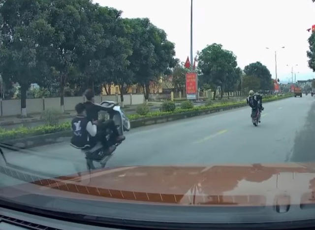 Vào thời điểm trên, một nam thanh niên không đội mũ bảo hiểm, điều khiển xe gắn máy sơn màu hồng đã bị che biển số, vừa "bốc đầu" xe vừa chạy với vận tốc khá lớn. Tiếp sau đó là 2 thanh niên đầu trần ngồi trên chiếc xe máy màu trắng cũng có hành vi tương tự.