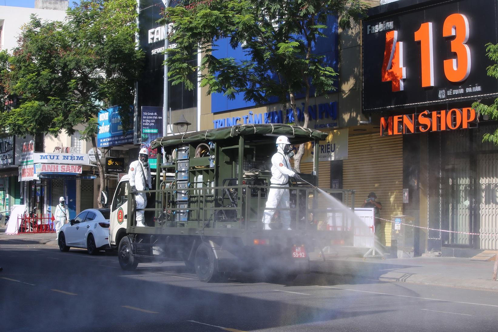 Bộ đội hóa học phun thuốc khử khuẩn trên đường phố Đà Nẵng. |