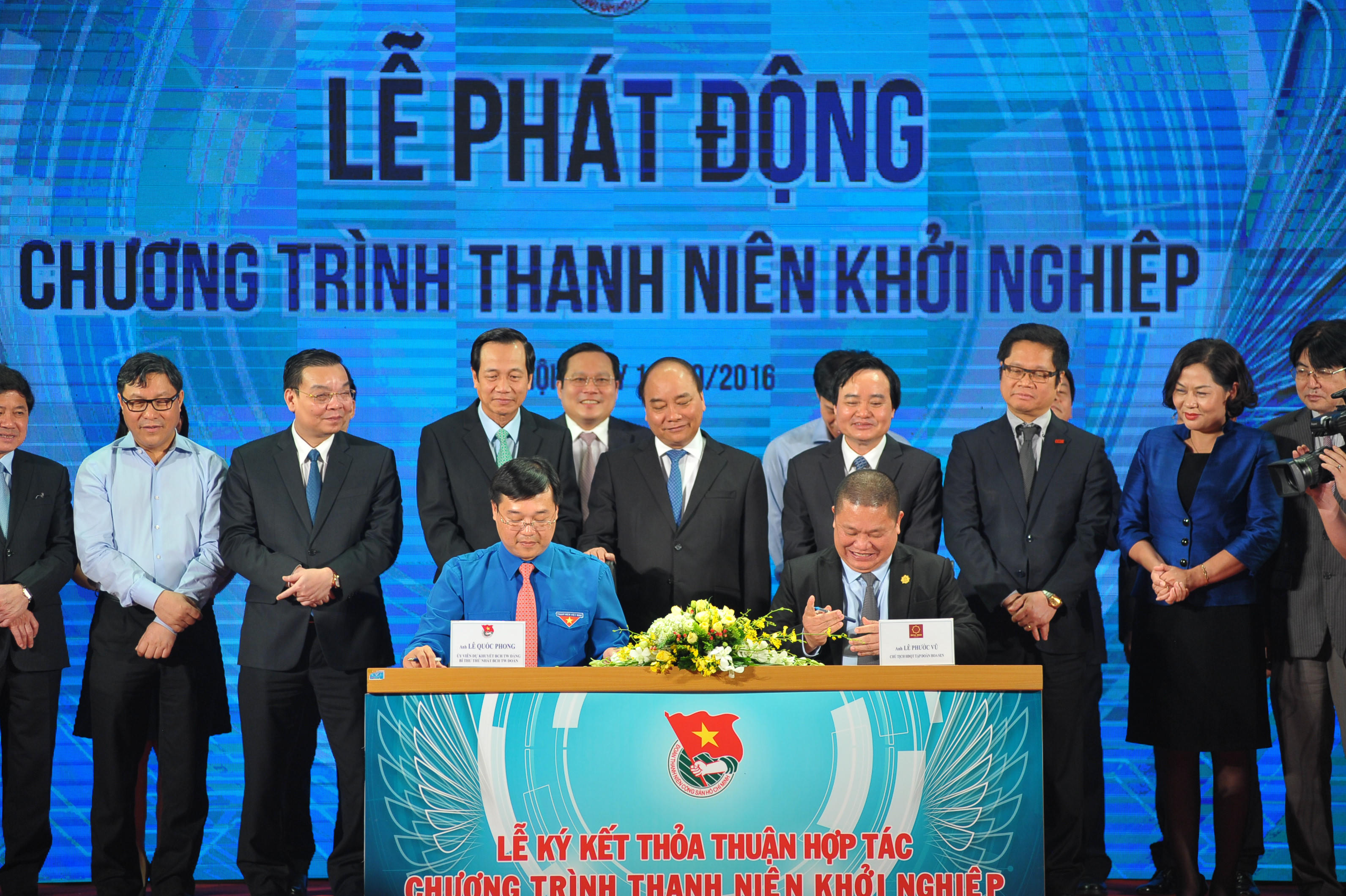 | Thủ tướng Nguyễn Xuân Phúc và lãnh đạo một số bộ, ngành chứng kiến lễ ký kết thỏa thuận hợp tác thanh niên khởi nghiệp do TƯ Đoàn tổ chức vào tháng 10/2016. |
