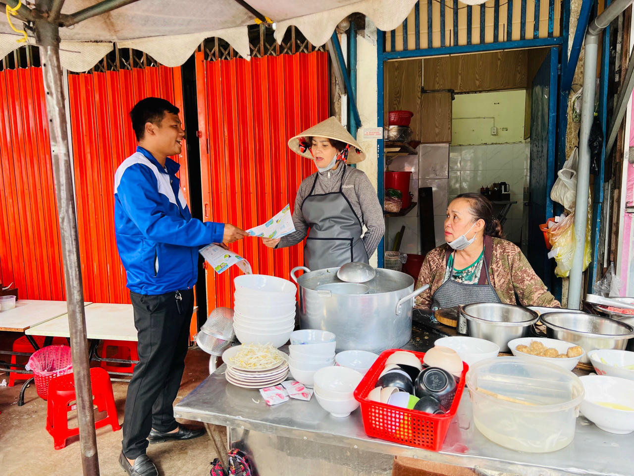 Phát tờ rơi tuyên truyền phòng chống đuối nước đến với người dân. |