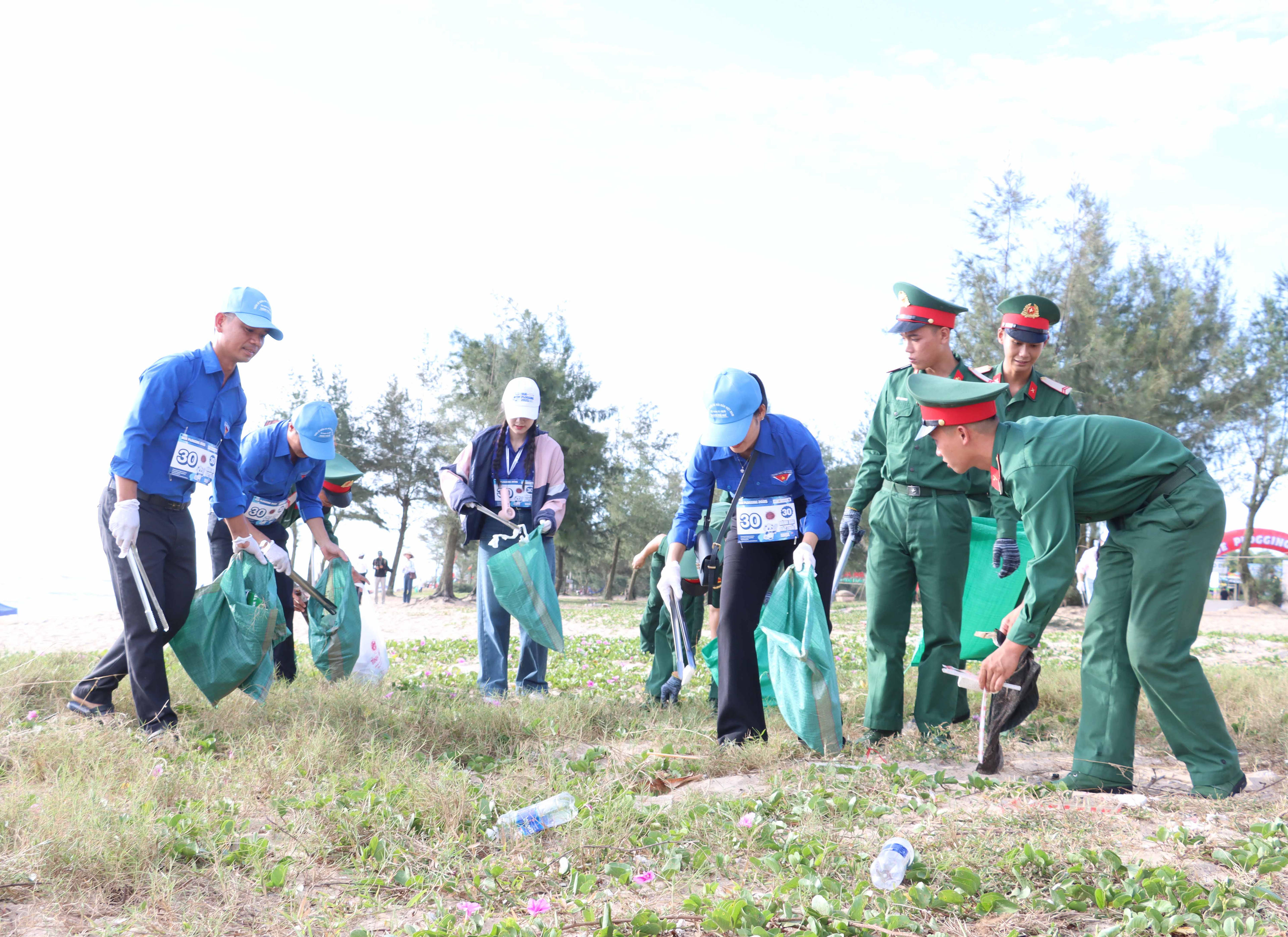 | Đại biểu và cán bộ, chiến sĩ và đoàn viên thanh niên tham gia đi bộ, nhặt rác trên bãi biển. |