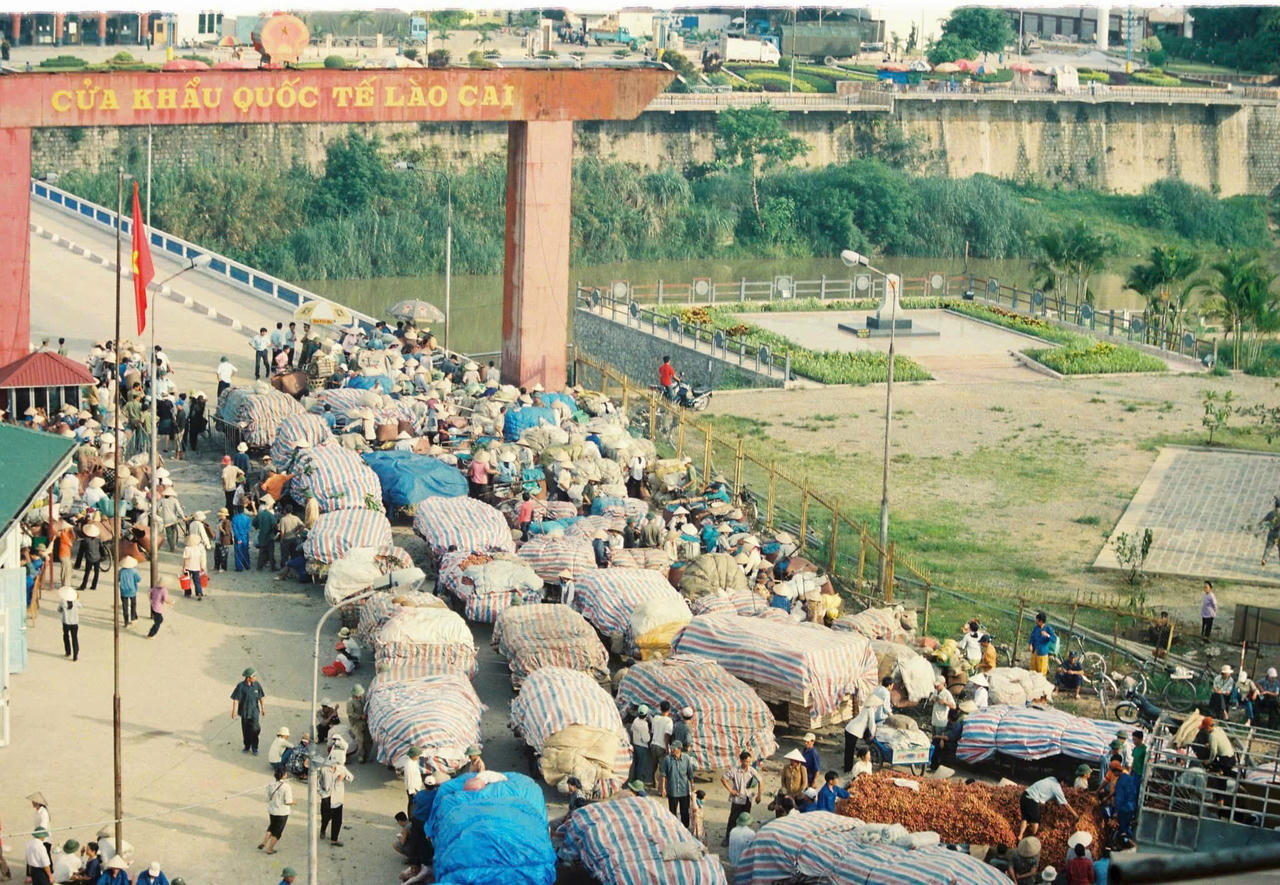 Cửa khẩu quốc tế Lào Cai đơn sơ với Quốc môn làm bằng gỗ (Ảnh Phạm Ngọc Triển) |