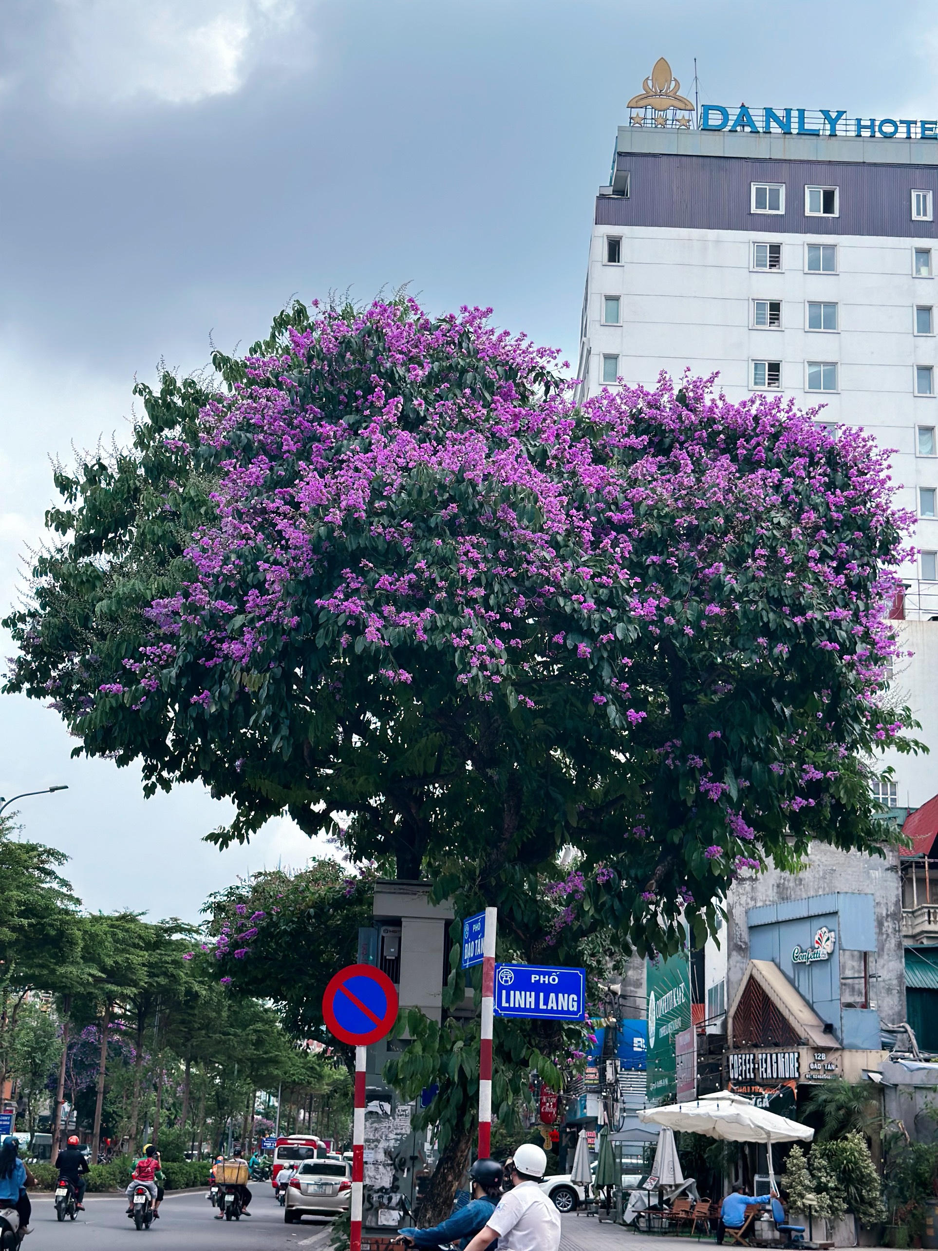 Cả một đoạn phố Kim Mã dài khoảng hơn 2km, có rất nhiều cây bằng lăng san sát, đua nhau khoe sắc tím mộng mơ