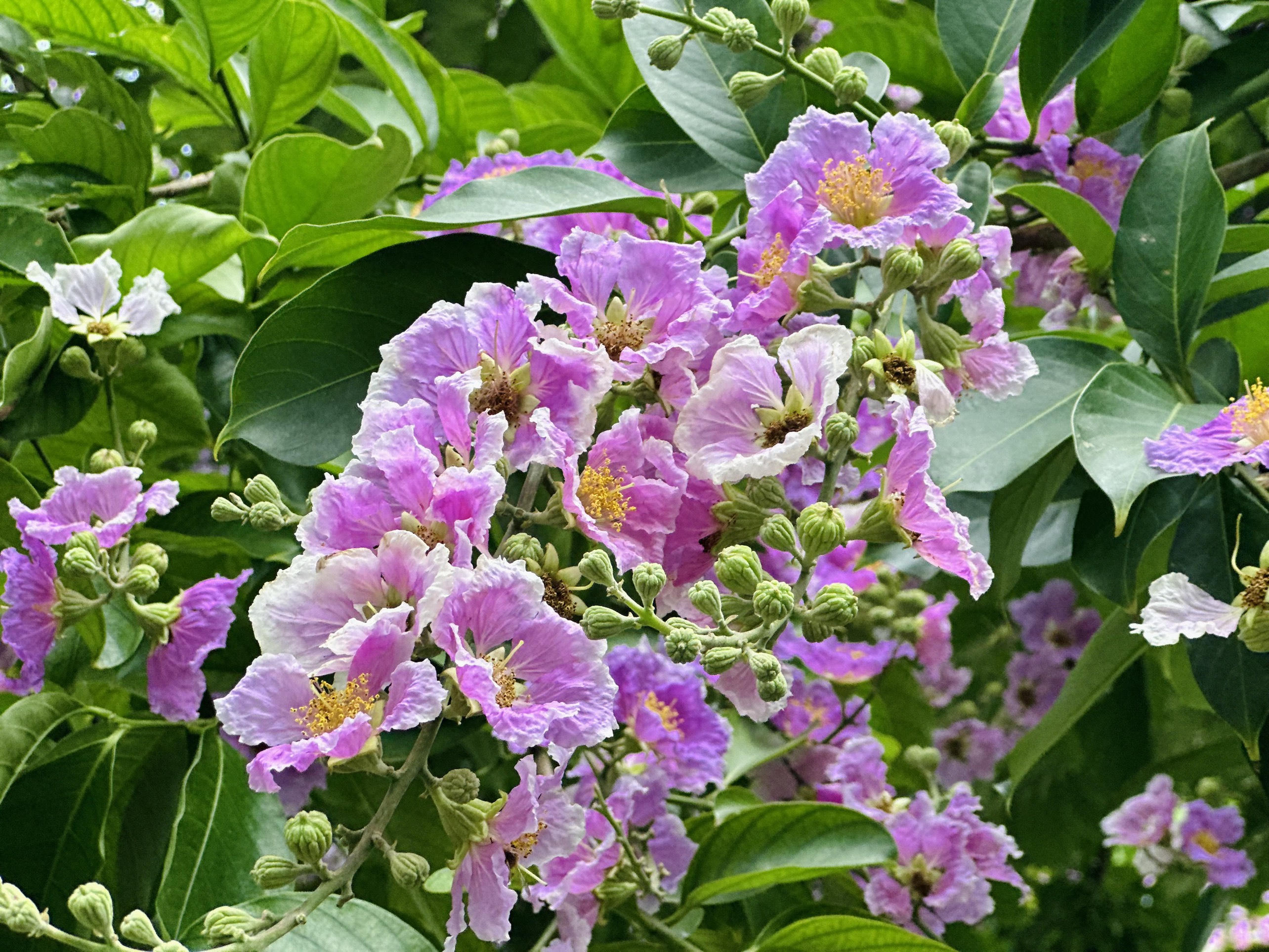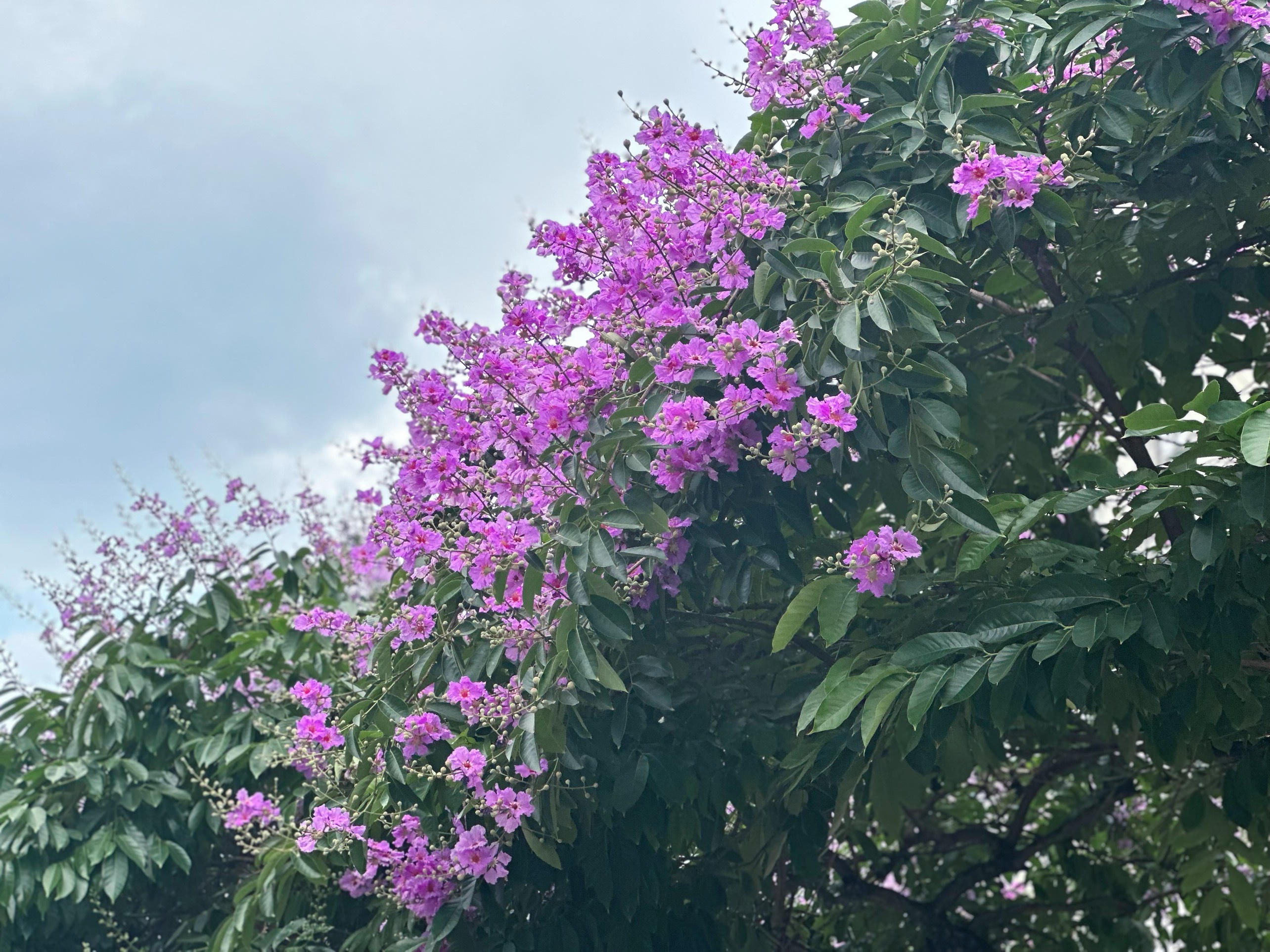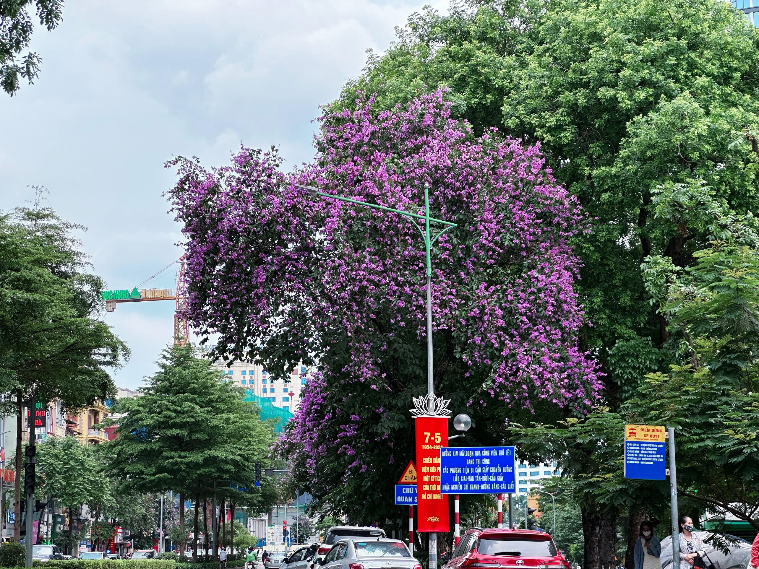 Cây hoa bằng lăng trên phố Hoàng Quốc Việt giao Nguyễn Phong Sắc với tán cao, hoa nở thành từng chùm sai trĩu...