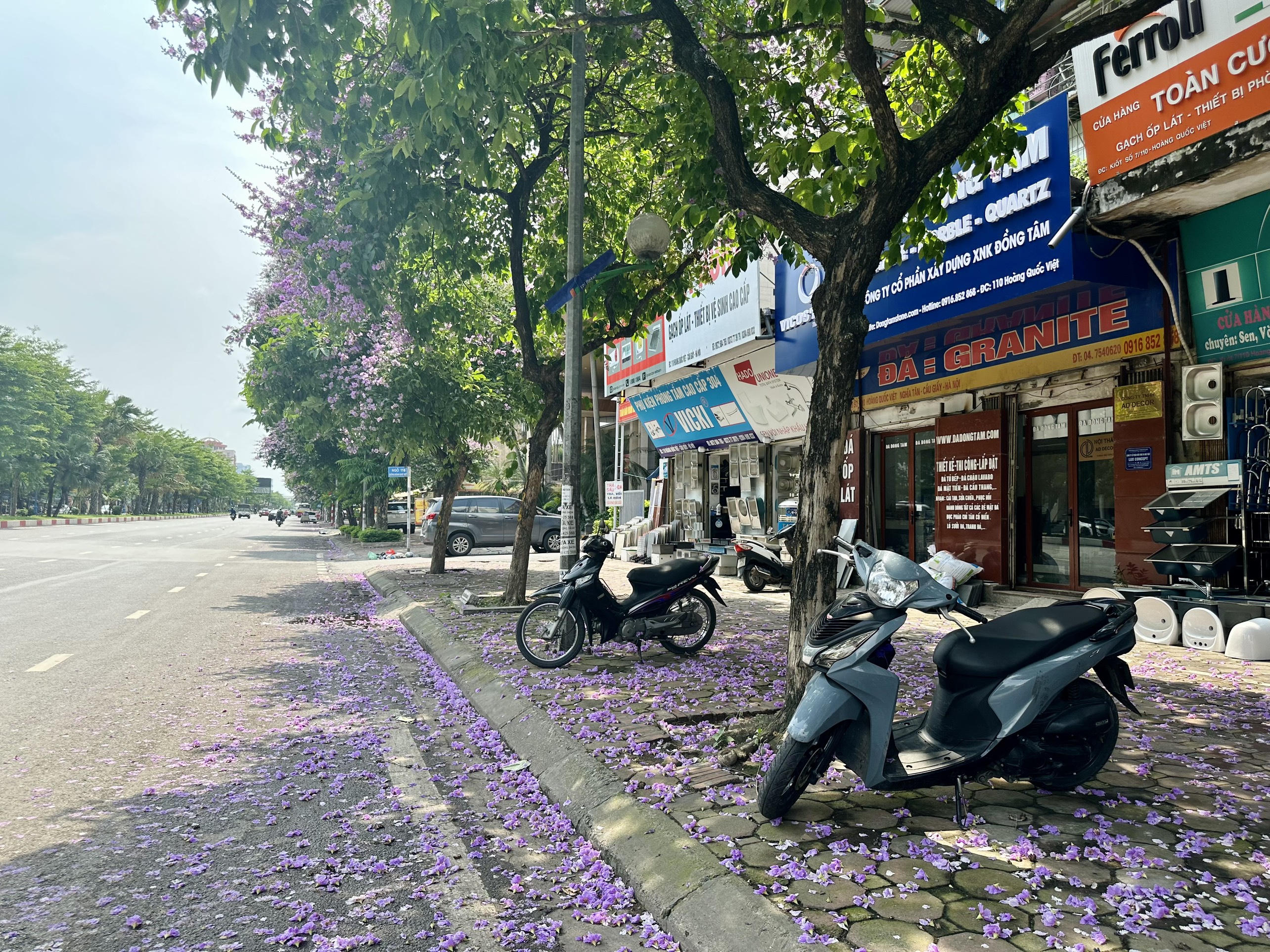 Hoa bằng lăng rụng phủ kín mặt đường và vỉa hè trên phố Hoàng Quốc Việt