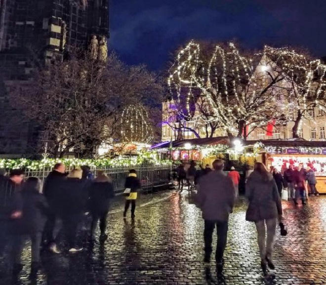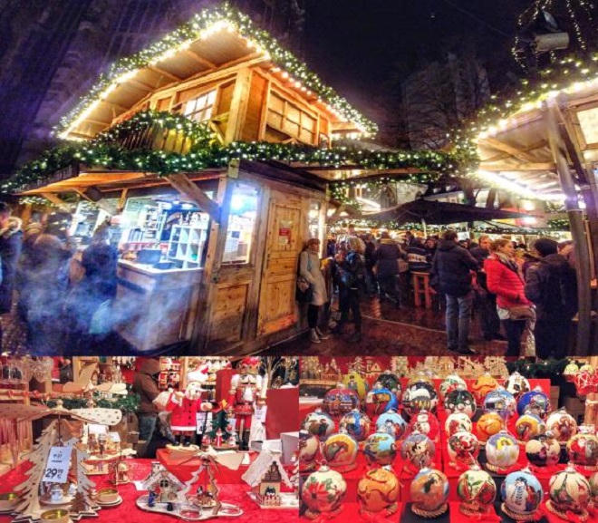 Một trong những tụ điểm quan trọng nhất là Ngôi làng Giáng sinh ở quảng trường Saint-Jacques, nơi mà bạn có thể tìm thấy đủ loại gian hàng bán đồ trang trí Giáng sinh, như vòng lá mùa vọng, các loại nến hương, những sợi dây kim tuyến đủ màu, các tấm hình nền, bưu thiếp Noel, hay các bức tượng nhỏ treo cây thông, các quả cầu bạc hay bằng thủy tinh có sơn thêm thú vật hay phong cảnh mùa đông, rực rỡ màu sắc, các loại đèn lồng hình ngôi sao rực rỡ lung linh, sắc màu kim quang soi sáng dự báo mùa lễ Hiển linh, đúng theo truyền thuyết ba vì vua từ phương xa đến thờ lạy Chúa, kính dâng lễ phẩm gồm bạc vàng, nhũ hương, mộc dược,