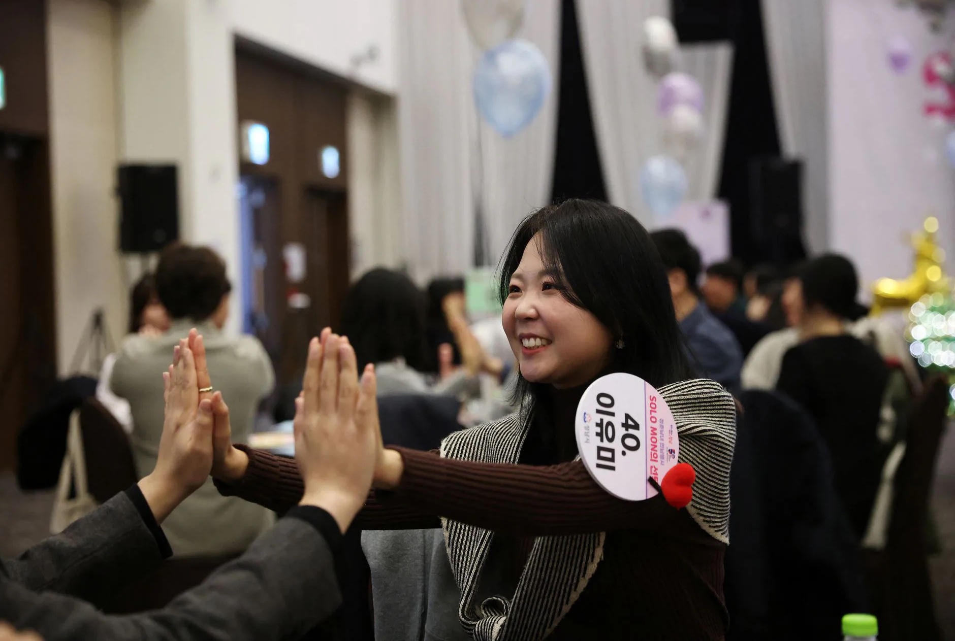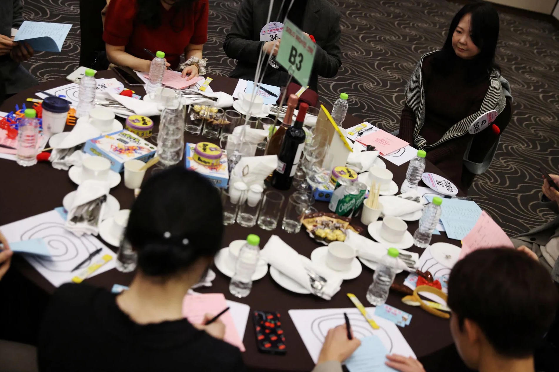 Những người tham gia, ở độ tuổi 20 và 30, ngồi lặng lẽ cạnh nhau đến khi huấn luyện viên về các mối quan hệ bắt đầu sự kiện bằng trò chơi oẳn tù tì, nhanh chóng khiến căn phòng tràn ngập tiếng nói chuyện và tiếng cười trong một khách sạn gần thủ đô Seoul ngày 19/11.
