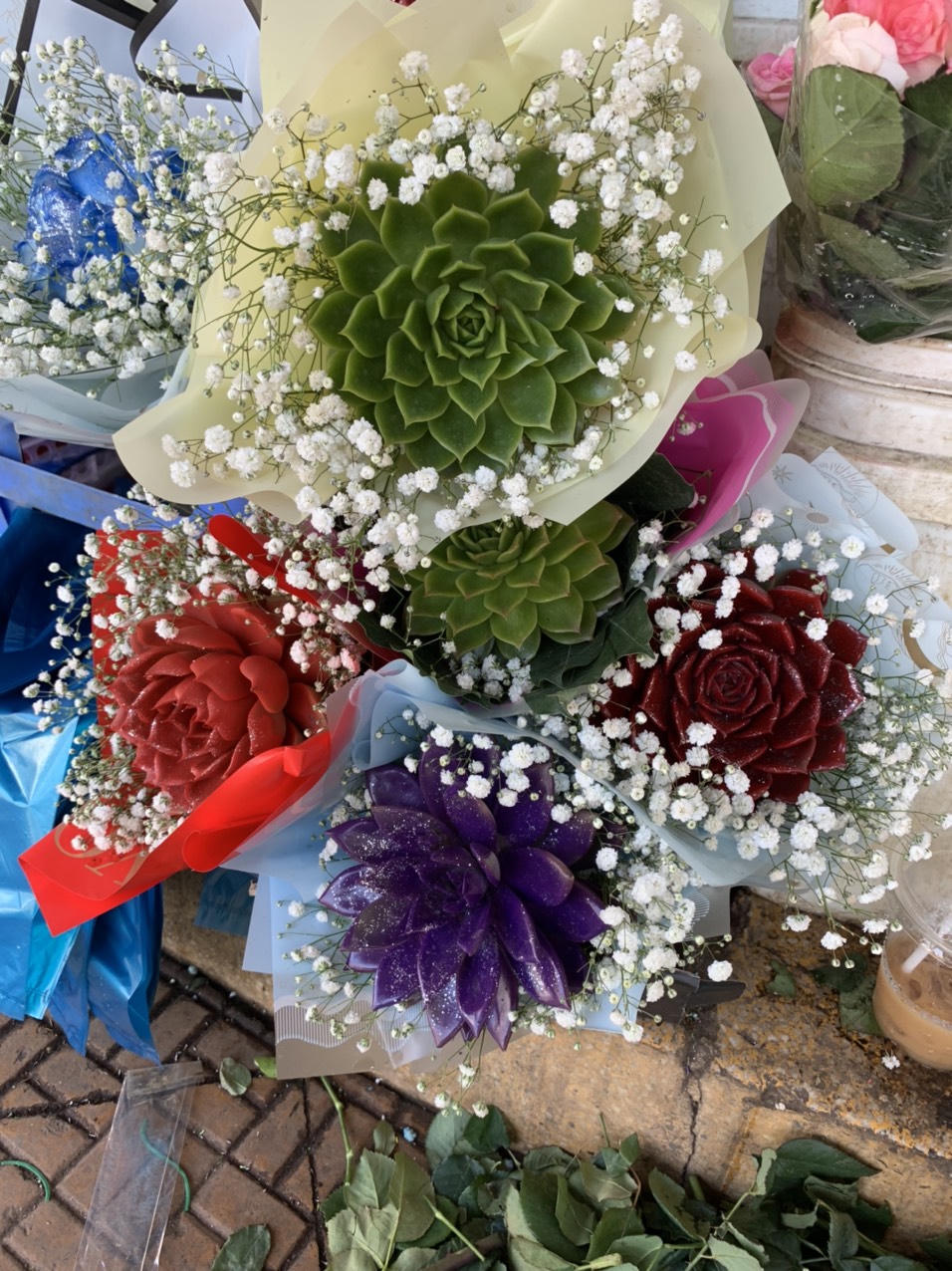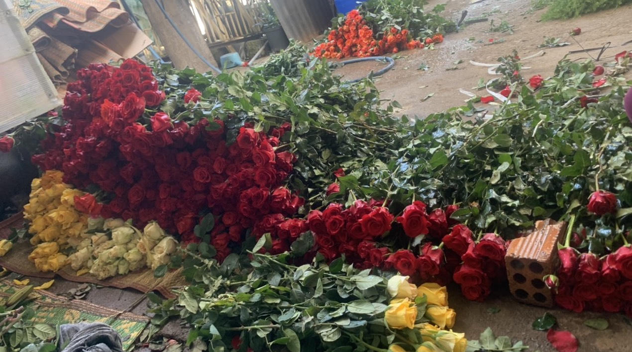 Quanh chợ Đà Lạt, hoa hồng trắng, xanh, vàng, hồng đồng giá 80 ngàn đồng/bó 10 bông; hoa hồng đỏ giá cao hơn là 130 ngàn đồng/bó 10 bông. |