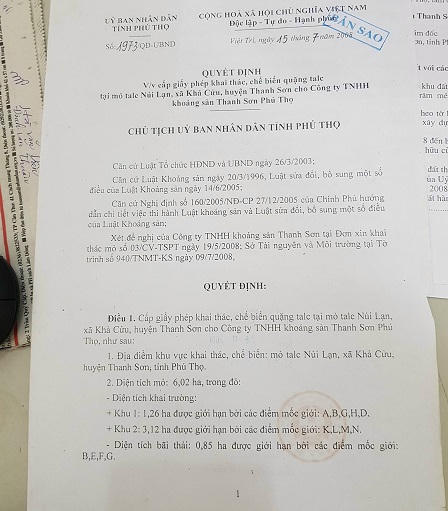 Theo như những tài liệu mà UBND xã Khả Cửu cung cấp cho thấy, ngày 14/4/2008, ông Đặng Đình Vượng – Phó chủ tịch UBND tỉnh Phú Thọ đã ký quyết định số 995/QĐ-UBND của UBND tỉnh Phú Thọ về việc chấp thuận dự án đầu tư khai thác, chế biến quặng Talc, mỏ Talc núi Lạn, xã Khả Cửu, huyện Thanh Sơn cho Công ty TNHH khoáng sản Thanh Sơn Phú Thọ với diện tích đất 6,02 ha, trong đó: Diện tích khu vực khai trường là 4,38 ha, diện tịch khu vực chế biến và các công trình khác là 1,64 ha (trong đó diện tích bãi thải là 0,85 ha).