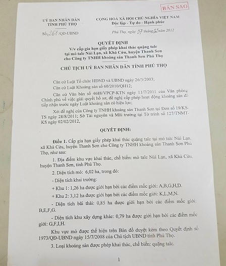 Tiếp đó, ngày 2/5/2013, ông Nguyễn Đình Cúc – Phó chủ tịch UBND tỉnh Phú Thọ ký quyết định số 1067/QĐ-UBND của UBND tỉnh Phú Thọ về việc phê duyệt đơn giá thuê đất cho Công ty TNHH khoáng sản Thanh Sơn Phú Thọ tại xã Khả Cửu, huyện Thanh Sơn với số tiền thuê đất để khai thác quặng Talc là 18,06 triệu đồng/năm, đơn giá được ổn định từ ngày 7/2/2012 đến ngày 7/2/2015. Từ đó đến không có thêm giấy phép gia hạn hay giấy tờ nào khác?