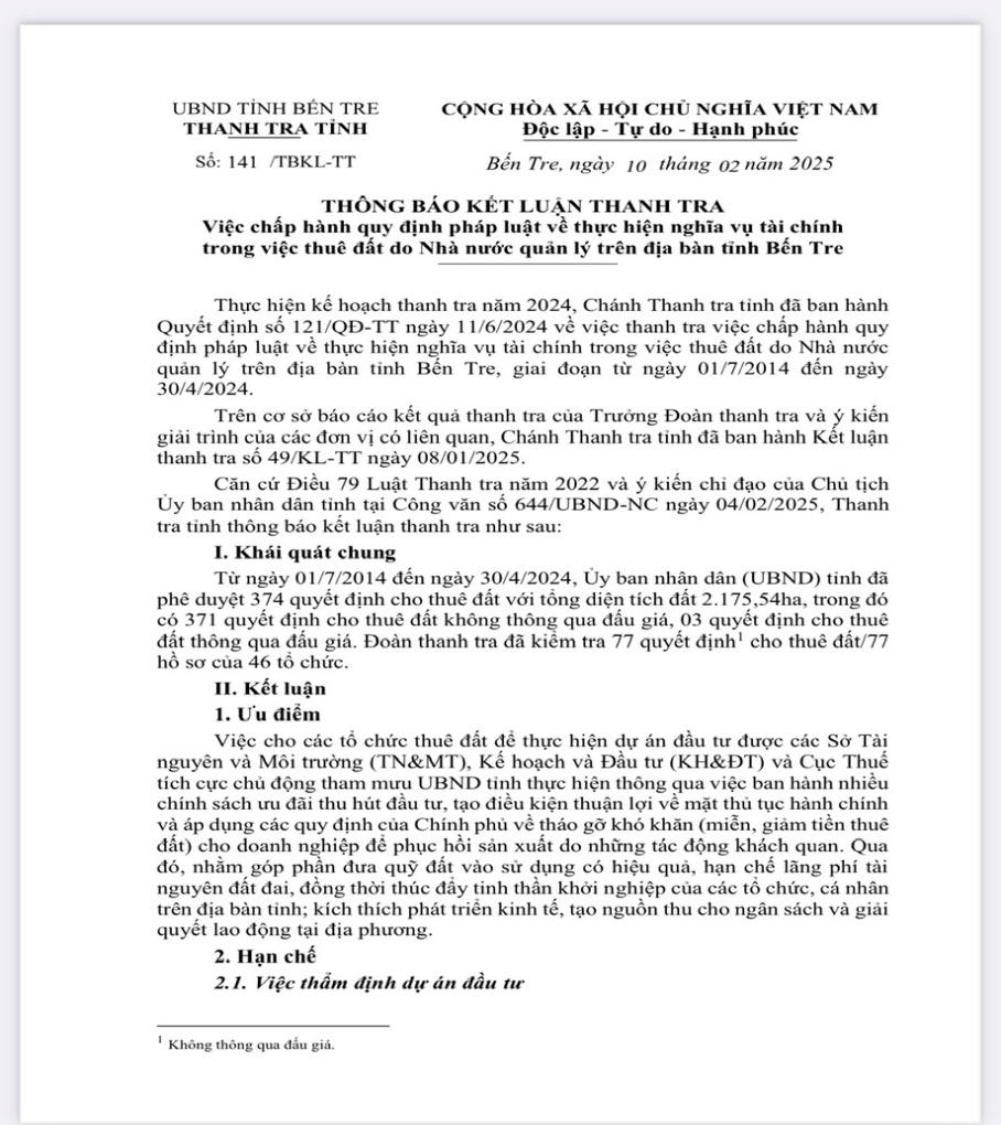 Thông báo KLTT của Thanh tra tỉnh Bến Tre. (Ảnh: Gia Hải) |