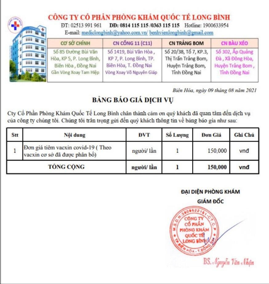 Trước đó, trên mạng xã hội đã lan truyền nhau về một số cơ sở phòng khám tư nhân trên địa bàn tỉnh Đồng Nai ra Bảng giá tiêm vaccine phòng COVID-19 với số tiền công tiêm dịch vụ là 150.000đ khi chưa được cơ quan chức năng phê duyệt gây bức xúc dư luận.