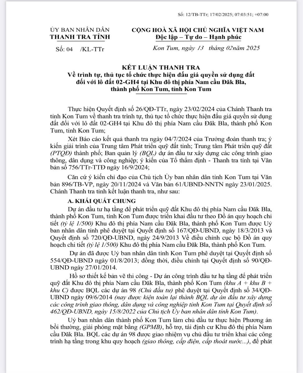 (PLVN) - Thanh tra tỉnh Kon Tum vừa ban hành Kết luận thanh tra về trình tự, thủ tục tổ chức thực hiện đấu giá quyền sử dụng đất (QSDĐ) với lô đất 02-GH4 tại khu đô thị phía Nam cầu Đăk Bla, TP Kon Tum.