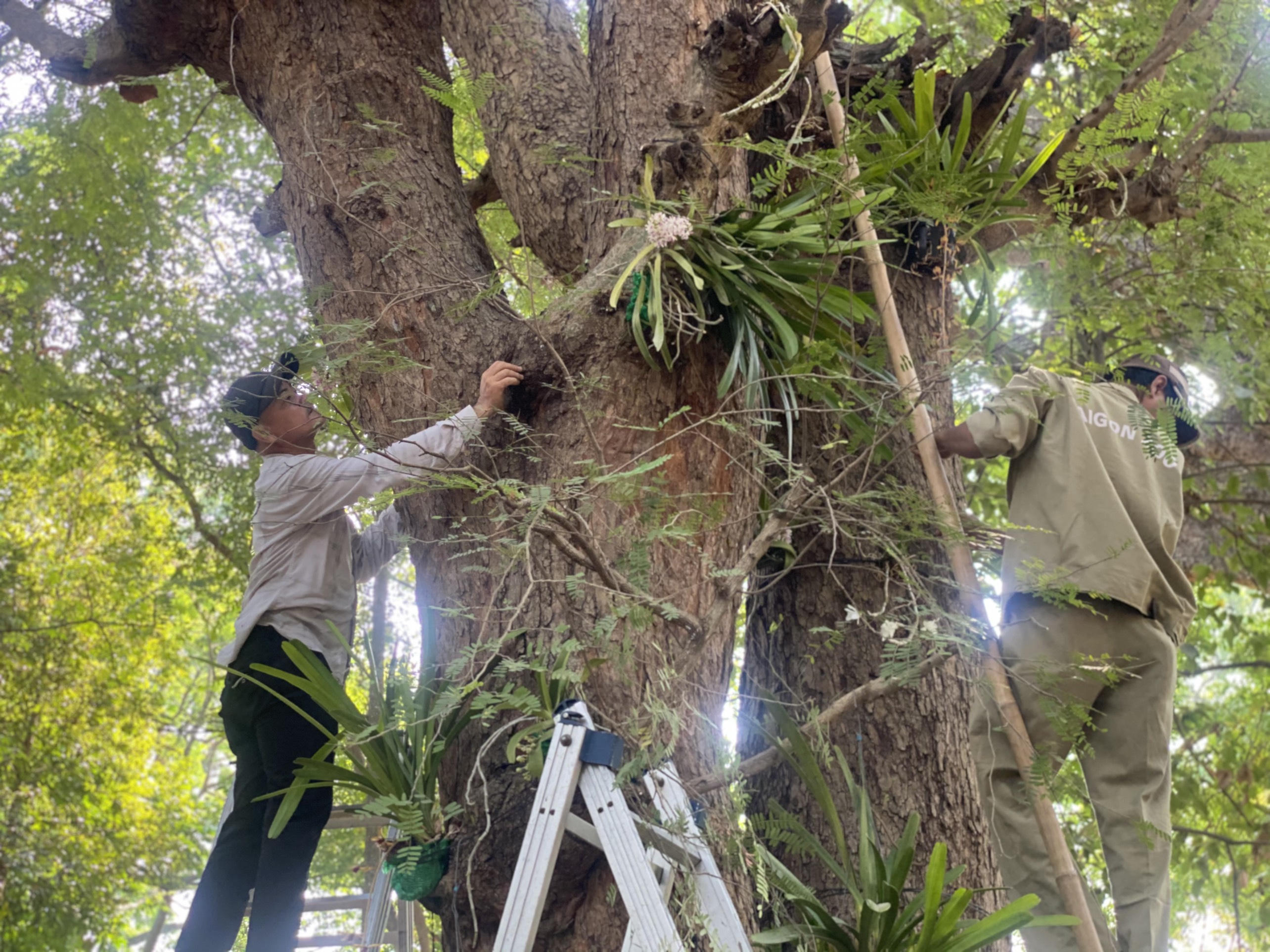 Kĩ thuật viên thực hiện cấy ghép lan rừng lên cây cổ thụ tại Thảo Cầm Viên Sài Gòn (ảnh Ngọc Mai) |