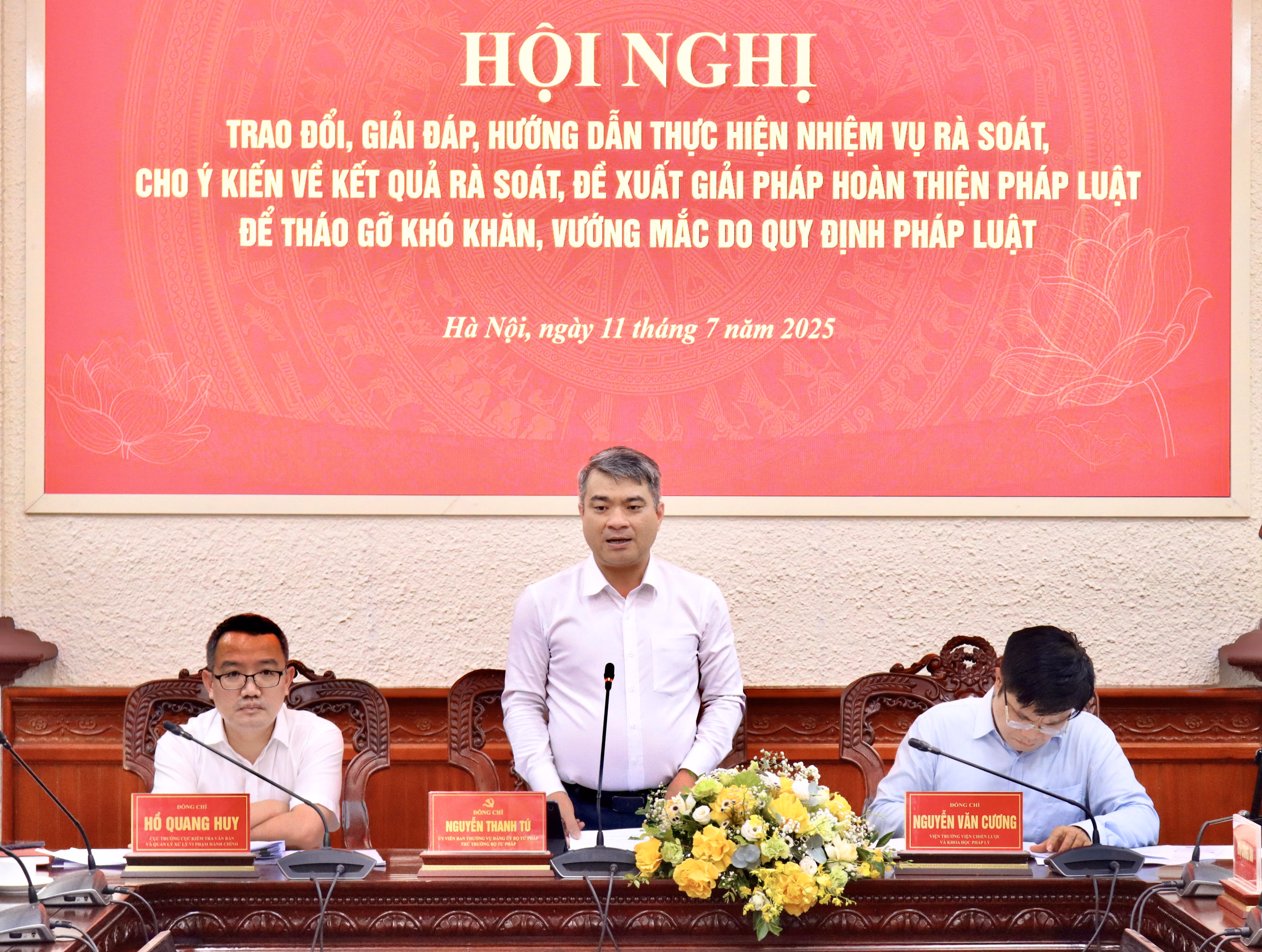 Đồng chủ trì có Cục trưởng Cục Kiểm tra văn bản và Quản lý xử lý vi phạm hành chính Hồ Quang Huy và Viện trưởng Viện Chiến lược và Khoa học pháp lý Nguyễn Văn Cương.