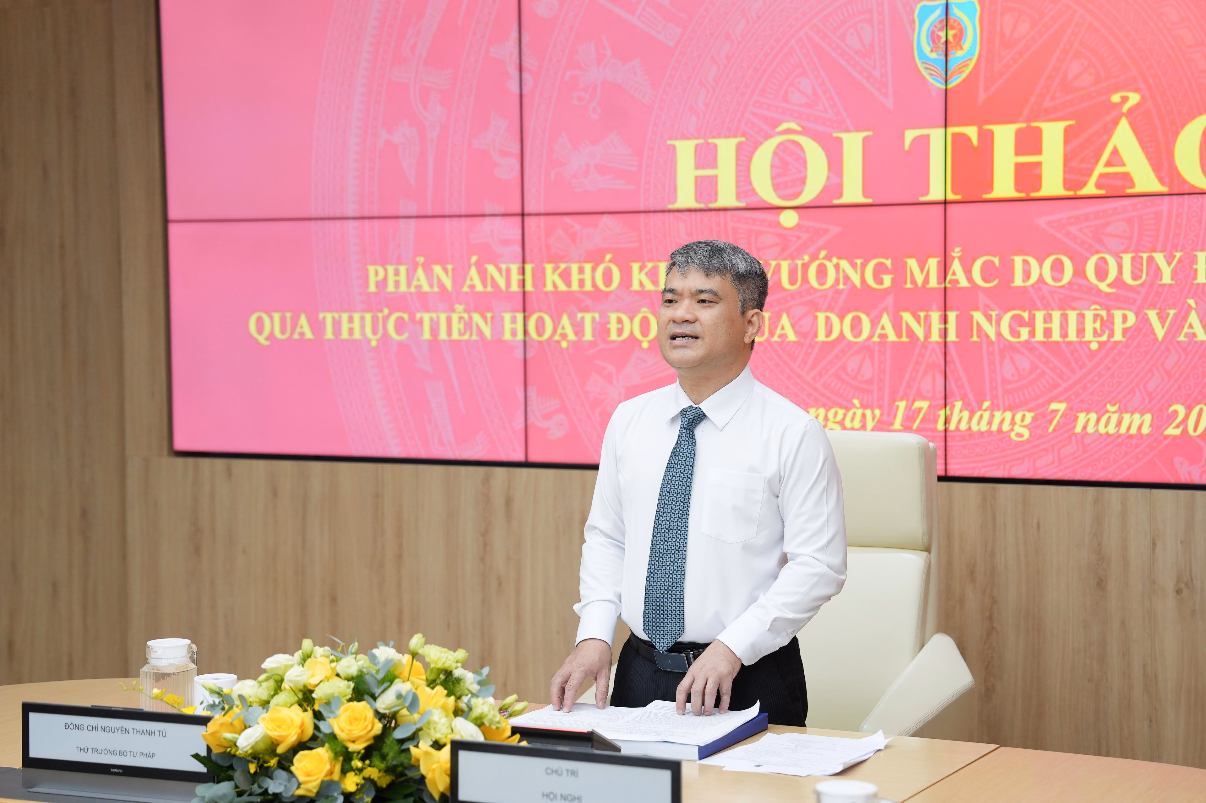 Phát biểu khai mạc Hội thảo, Thứ trưởng Nguyễn Thanh Tú khẳng định, việc tổ chức Hội thảo không chỉ thể hiện tinh thần cầu thị mà còn là minh chứng cho quyết tâm mạnh mẽ của Bộ Tư pháp trong việc đồng hành cùng cộng đồng doanh nghiệp, đặc biệt là các doanh nghiệp “đầu tàu” của nền kinh tế. Thứ trưởng nhấn mạnh, những khó khăn, vướng mắc do quy định pháp luật nếu không được kịp thời tháo gỡ sẽ trở thành lực cản, kìm hãm sự phát triển kinh tế - xã hội, đặc biệt là mục tiêu tăng trưởng 8% trong năm nay và hai con số trong các năm tiếp theo.
