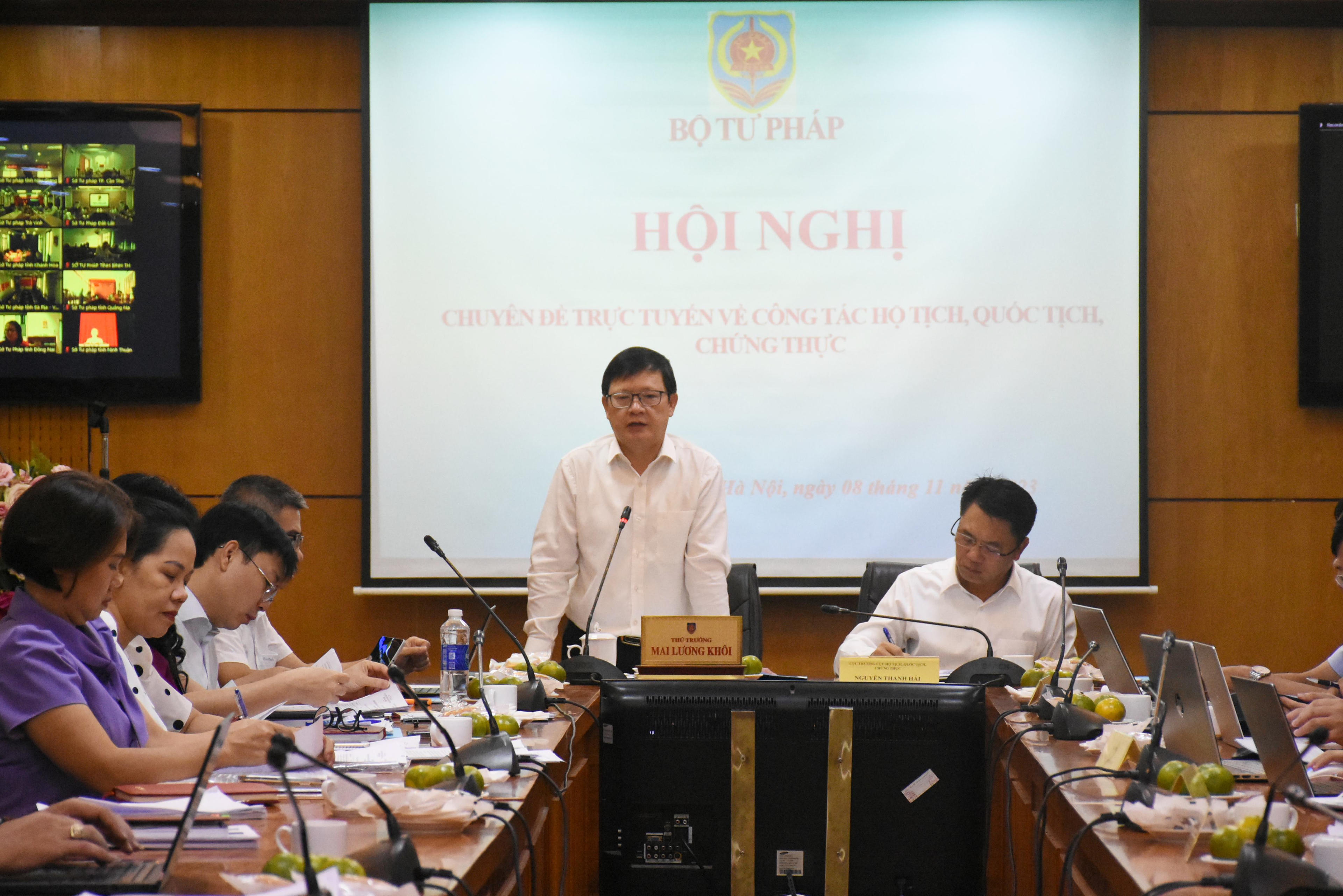 (PLVN) - Sáng 8/11, Bộ Tư pháp đã tổ chức Hội nghị trực tuyến chuyên đề lĩnh vực hộ tịch, quốc tịch, chứng thực với sự chủ trì của Thứ trưởng Mai Lương Khôi. Điều hành Hội nghị có ông Nguyễn Thanh Hải, Cục trưởng Cục Hộ tịch, quốc tịch, chứng thực.
