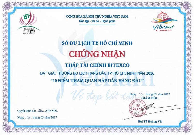 (PLO) - Theo Quyết định số 166/QĐ-SDL ngày 23 tháng 3 năm 2017 của Sở Du Lịch Thành Phố, Tòa Tháp Tài Chính Bitexco liên tiếp 03 năm vinh dự được chứng nhận là một trong “10 điểm tham quan hấp dẫn nhất” hàng đầu thành phố Hồ Chí Minh năm 2016.