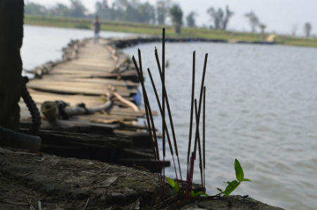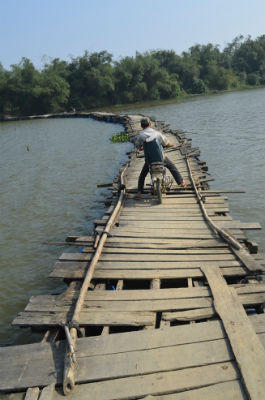 Có mặt tại đây đúng lúc người dân đang đi lại mới cảm nhận hết sự hãi hùng khi đi qua chiếc cầu phao này. Những hình ảnh vặn vẹo, rệu rã hình vòng cung của cây cầu phao tách ra khỏi những cây trụ nằm cách đó không xa với những tiếng kêu cót két phát ra từ những cây tre đã mục mỗi lần đi qua.