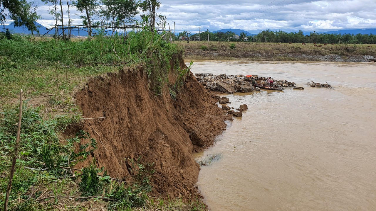 Mưa lớn kéo dài và đặc biệt là trận lũ vừa qua khiến bờ sông ngày càng sạt lở nặng. Cả cây số bờ kè bảo vệ bị đánh sập. Chính quyền xã đã giăng dây, gắn biển cảnh báo nguy hiểm nhằm cấm người và phương tiện đến gần điểm sạt lở bờ sông”, ông Xung nói.
