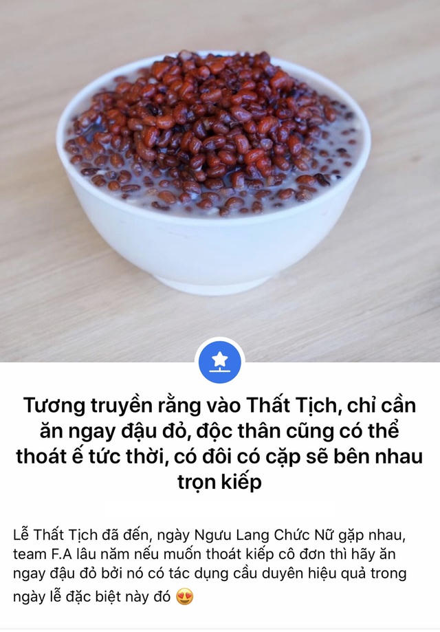 Chính quan niệm này đã khiến cho những ngày thất tịch "cháy hàng" các món ăn liên quan đậu đỏ, đặc biệt là món chè đậu đỏ được giới trẻ Việt ưa chuộng hơn cả, với mong muốn thoát "ế" vào ngày này năm sau.