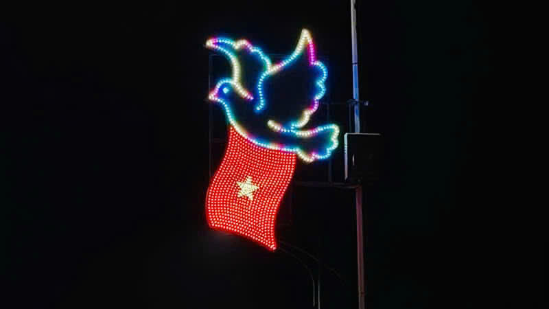 Lá cờ đỏ sao vàng cùng chú chim bồ câu tượng trưng cho biểu tượng hòa bình. |