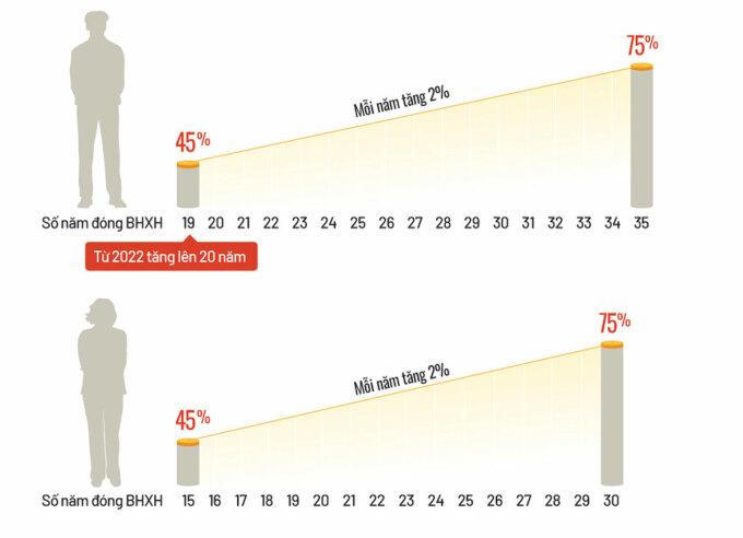 Từ 2022, số năm đóng BHXH để hưởng lương hưu của lao động nam có sự điều chỉnh, muốn hưởng mức tối thiểu 45% phải đóng đủ 20 năm BHXH trở lên thay vì 19 năm như hiện hành. Còn muốn hưởng tỷ lệ tối đa 75%, lao động nam đóng đủ BHXH từ 35 năm, tăng thêm một năm so với 2021.