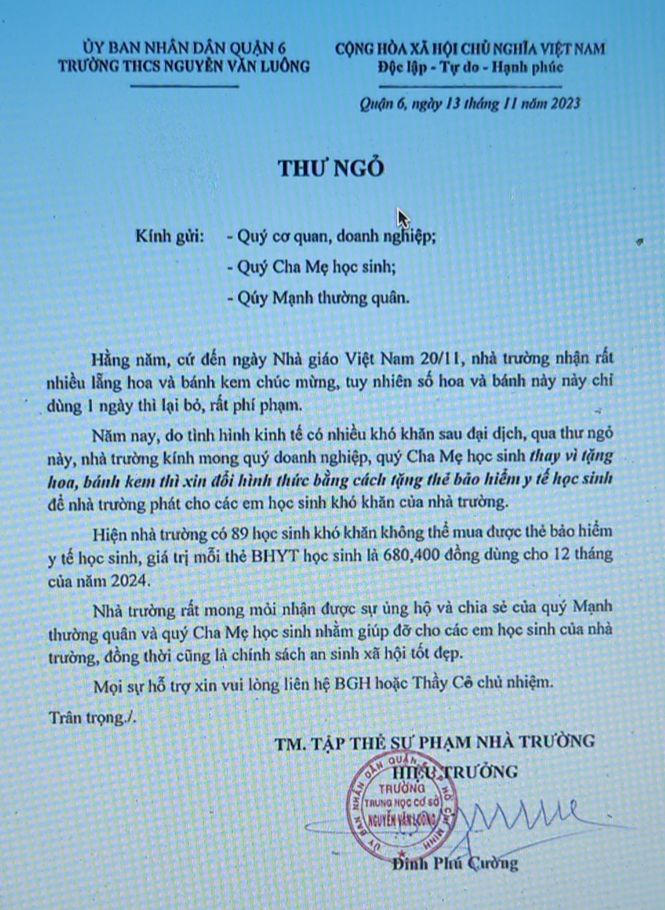 Năm nay, do tình hình kinh tế có nhiều khó khăn sau đại dịch, qua thư ngỏ này, nhà trường kính mong quý doanh nghiệp, quý cha mẹ học sinh thay vì tặng hoa, bánh kem thì xin đổi qua hình thức bằng cách tặng thẻ bảo hiểm y tế học sinh để nhà trường phát cho những em học sinh khó khăn của trường".