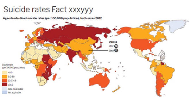 Theo Tổ chức Y tế Thế giới (WHO), năm 2012, tỷ lệ tự tử ở Trung Quốc là 7, 8/100.000, người năm 2016, tỷ lệ này là 8/100.000 người, xếp thứ 103 trong số 183 quốc gia. Dữ liệu cho thấy tỷ lệ tăng lên trong những năm gần đây.